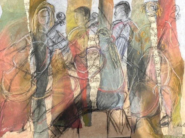 The start of a painting is usually figurative but becomes more abstract as line and colour dictate and recently there have been a series of collages using sketches of musicians rehearsing.